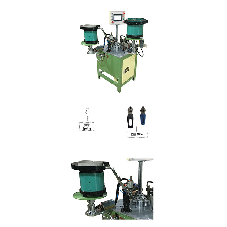 Slider ແລະ puller ແມ່ນປ້ອນຈາກພາກສ່ວນ feeder ຜ່ານຄູ່ມືຫຼັງຈາກນັ້ນປະກອບອັດຕະໂນມັດ.